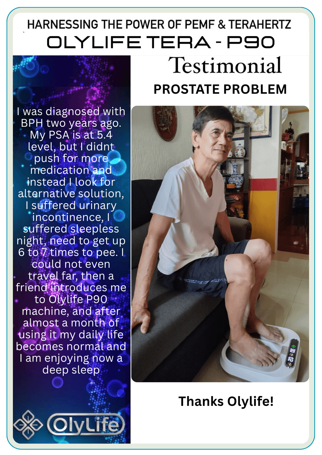 Hi there! I'm WILLIE CEJO just wanted to reach out because I know how challenging having any health problems can be, and I genuinely want to help. I’m 65 years old, and just last year, I was diagnosed with BPH (Benign Prostatic Hyperplasia). My PSA was at 5.4, and it was a daily struggle, I couldn’t travel far because of urinary incontinence, and my nights were restless, waking up 5 to 6 times just to pee. I was always exhausted and weak. But then a friend told me about PEMF therapy. I wasn’t sure about it at first, but I gave it a try. Within just two months, I noticed a huge difference I started sleeping soundly, my bathroom trips became fewer, and I regained my energy. It felt like I got my life back. It worked so well that I decided to get my own OlyLife teraP90 device, and now I’m living normally again without any medication. If you’re experiencing similar symptoms, I’d love to share what I’ve learned and help you experience the same relief.